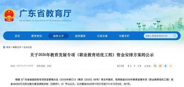 11月27日配资公司100强,广东省教育厅发布《关于2026年教育发展专项(职业教育培优工程)资金安排方案的公示》,对广东省2026年教育发展专项(职业教育培优工程)资金46000万元的分配方案及绩效目标予以公示。